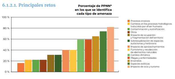 Por completo que sea el informe, los datos sobre las amenazas en ciernes no se muestran en relación a cada Parque. Si bien, en general se ve que el impacto del ocio y el turismo afecta a un 80% de los PP.NN., siendo el principal reto, seguido por la presencia de especies exóticas y por los incendios. Aún con esto, en la leyenda de la infografía se resalta que el OAPN no ha tenido acceso a información más que de 12 Parques, poniendo de nuevo el acento en la falta de datos. Además, el estado de los distintos hábitats varía mucho entre Parques, como se puede apreciar en el Gráfico 4 (OAPN, p. 40).